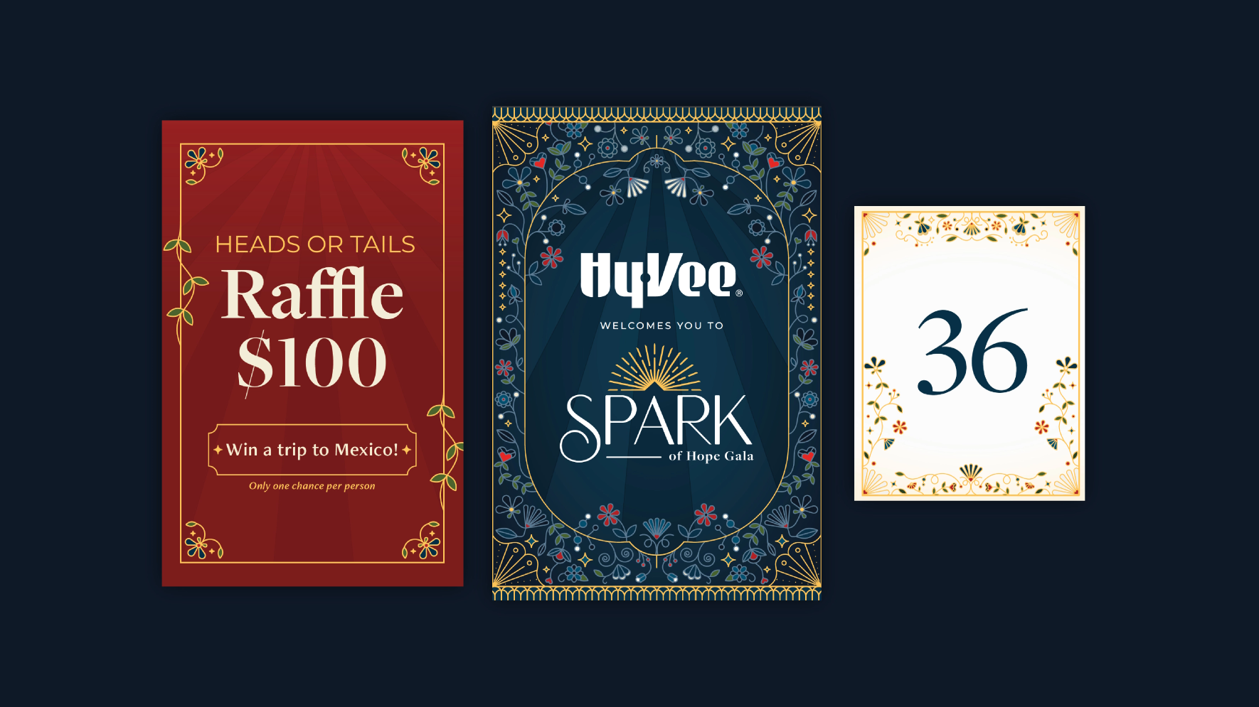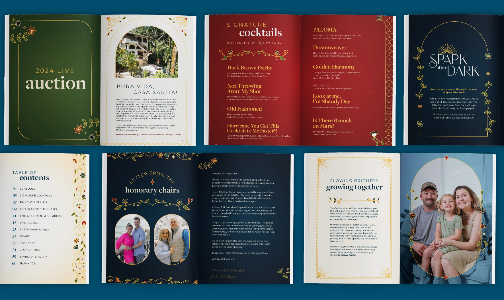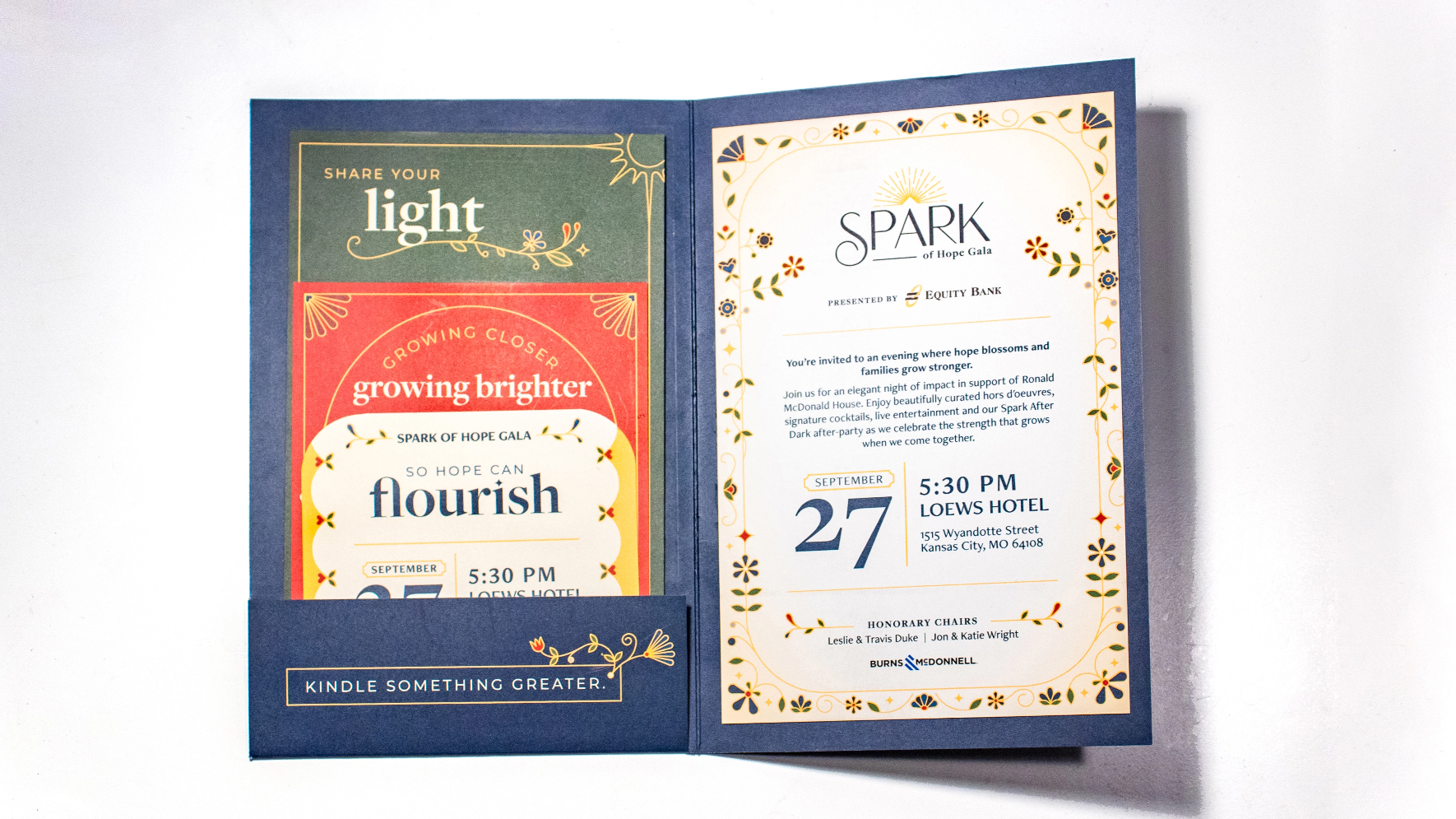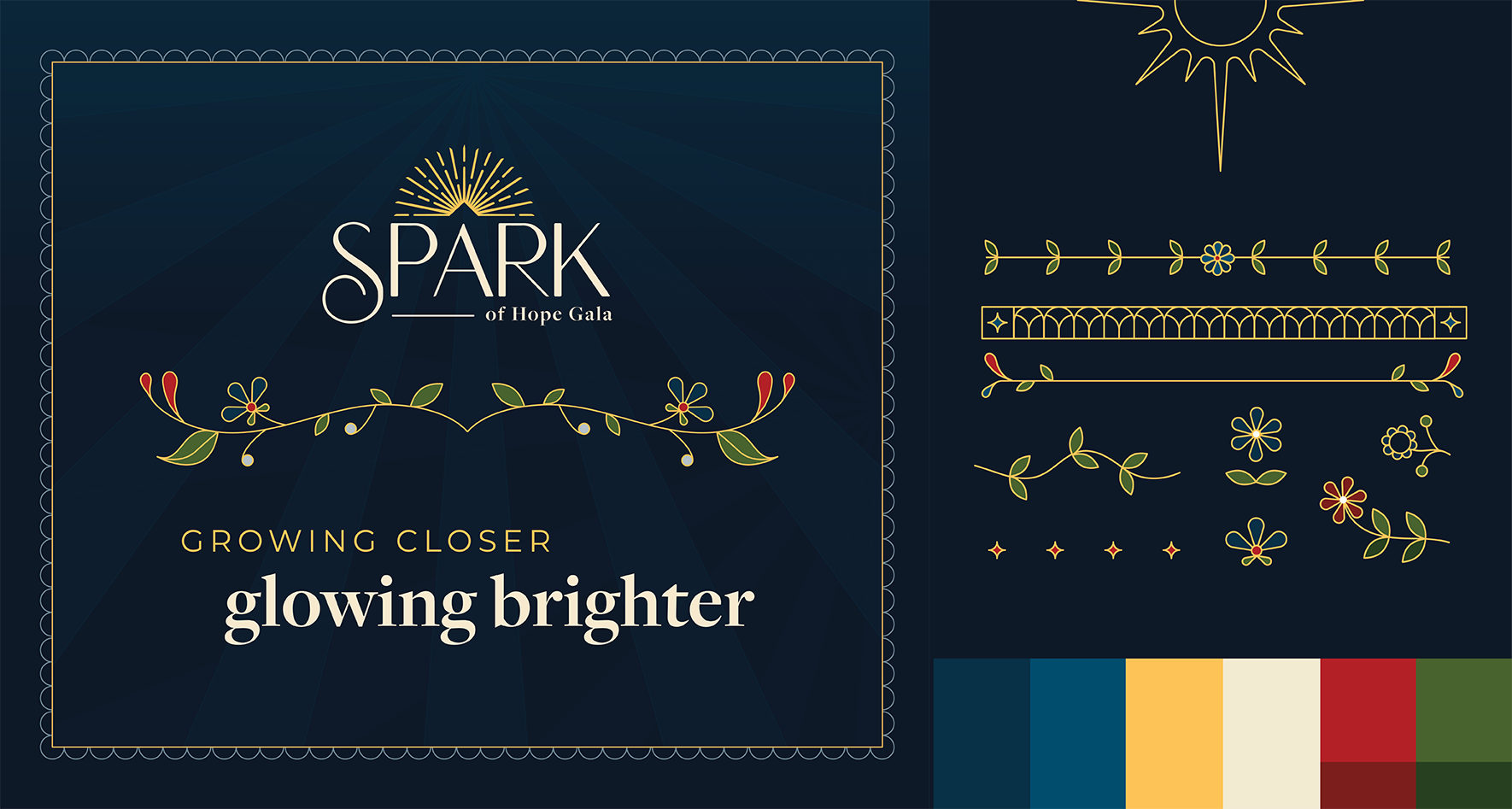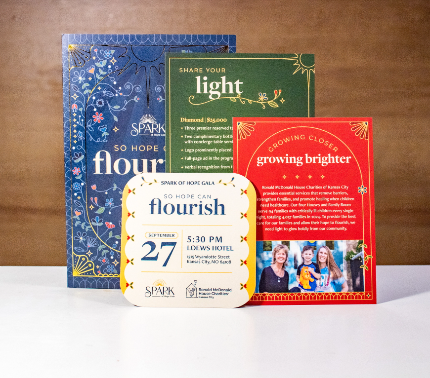 The support of a compassionate community provides a light that grows brighter—allowing hope to flourish and families to keep moving forward together. For the design elements, the sun was used to symbolize the light RMHKC brings to the community. Floral illustrations represented growth and hope. These elements were paired with subtle art deco designs that have come to represent Spark.